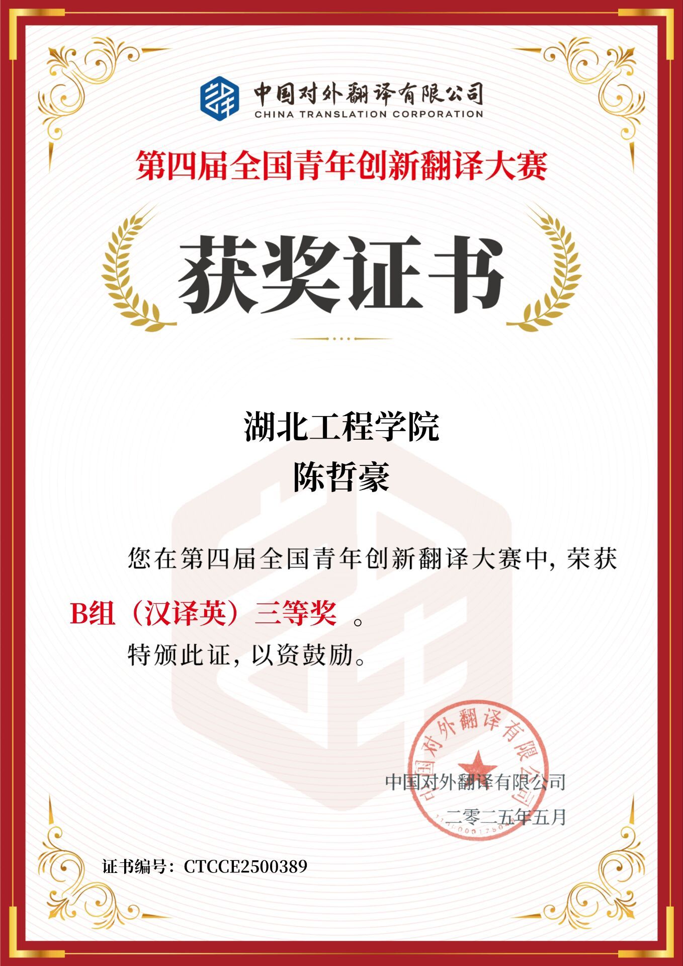 近日,第四届全国青年创新翻译大赛(China Young Translators’ Contest,简称CYTC)圆满落下帷幕。经过激烈角逐,公司学子陈哲豪荣获B组(汉译英)三等奖和优秀奖。