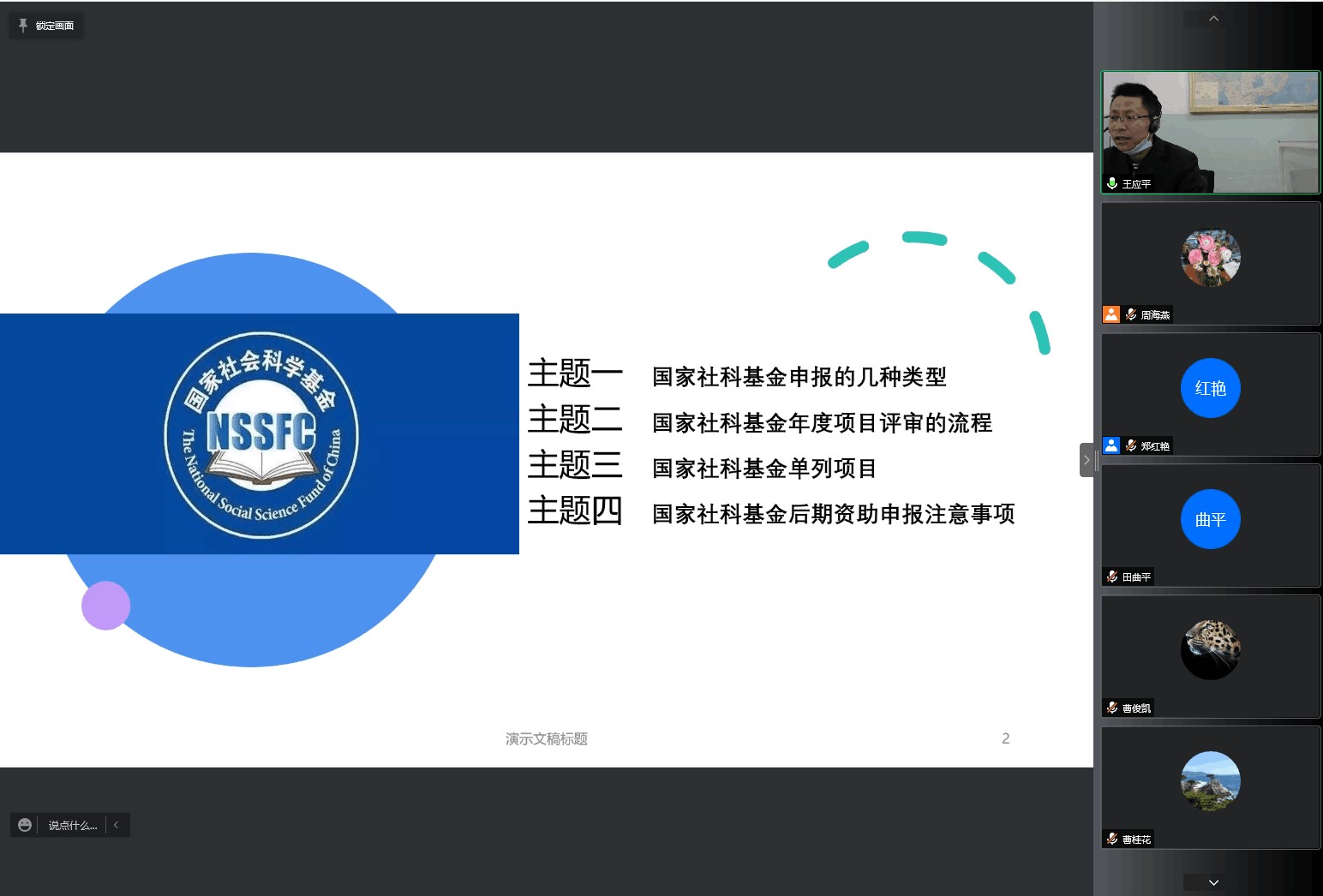 1月14日下午,公司特邀国家社科基金项目获批教师王应平博士在腾讯会议平台为全体教师作了国家社科基金项目主题讲座。2138cc太阳集团官网入口骨干教师和青年教师聆听了讲座,讲座由2138cc太阳集团官网入口郑红艳副经理主持。