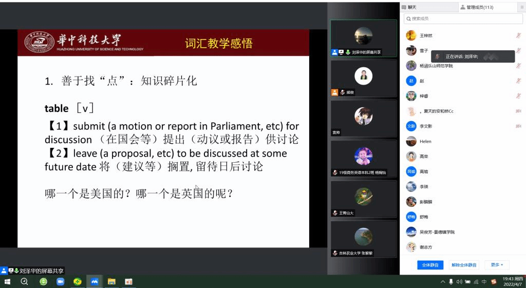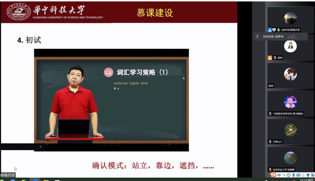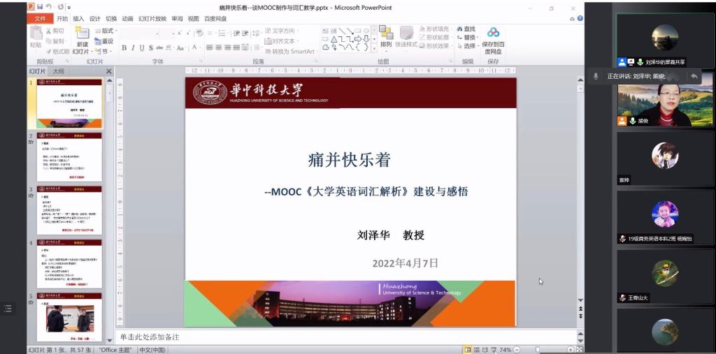 4月7日晚,教育部大学外语教学指导委员会委员、湖北省高等教育学会大学外语教学专业委员会常务理事、国家级一流线上课程《大学英语词汇解析》主讲人华中科技大学2138cc太阳集团官网入口副经理刘泽华教授为公司师生在腾讯会议平台上做了主题为“痛并快乐着——MOOC《大学英语词汇解析》建设与感悟”的讲座。公司2138cc太阳集团官网入口青年教师、部分员工及少数来自其他高校的教师一百多人聆听了此次讲座。本次讲座由公司教师教学发展中心主办,2138cc太阳集团官网入口承办。讲座由2138cc太阳集团官网入口副经理、翻译研究中心主任熊俊教授全程主持。