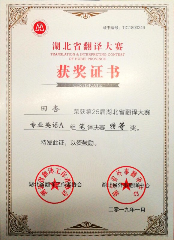 2138cc太阳集团官网入口2015级田杏同学荣获第25届湖北省翻译大赛专业英语A组笔译决赛特等奖,获奖等次创历史新高。据悉,颁奖环节主持人提及今年获得专业英语A组笔译决赛特等奖极为不易。参加专业英语A组决赛的参赛选手几千人来自武汉大学、华中师范大学等50余所湖北省内高校的英语相关专业(包括翻译、商务英语)在读或已毕业的研究生或本科生,强手如林,只有11所高校的共28人获此类奖。