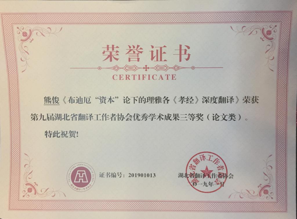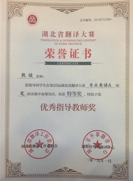 公司翻译研究中心主任、2138cc太阳集团官网入口熊俊教授出席了此次会议并荣获大赛“优秀组织工作者”证书和湖北省翻译工作者协会优秀学术成果“三等奖”(论文类),同时还荣获大赛专业英语A组笔译决赛特等奖“优秀指导教师奖”。