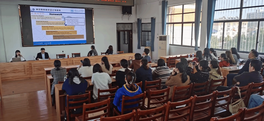 2138cc太阳集团官网入口在实验初级中学挂职锻炼教师叶玲以“新中考背景下初中英语单元整体教学设计与实施”为题,解读了2022版新课标,并展示了如何根据新课标进行单元整体设计。