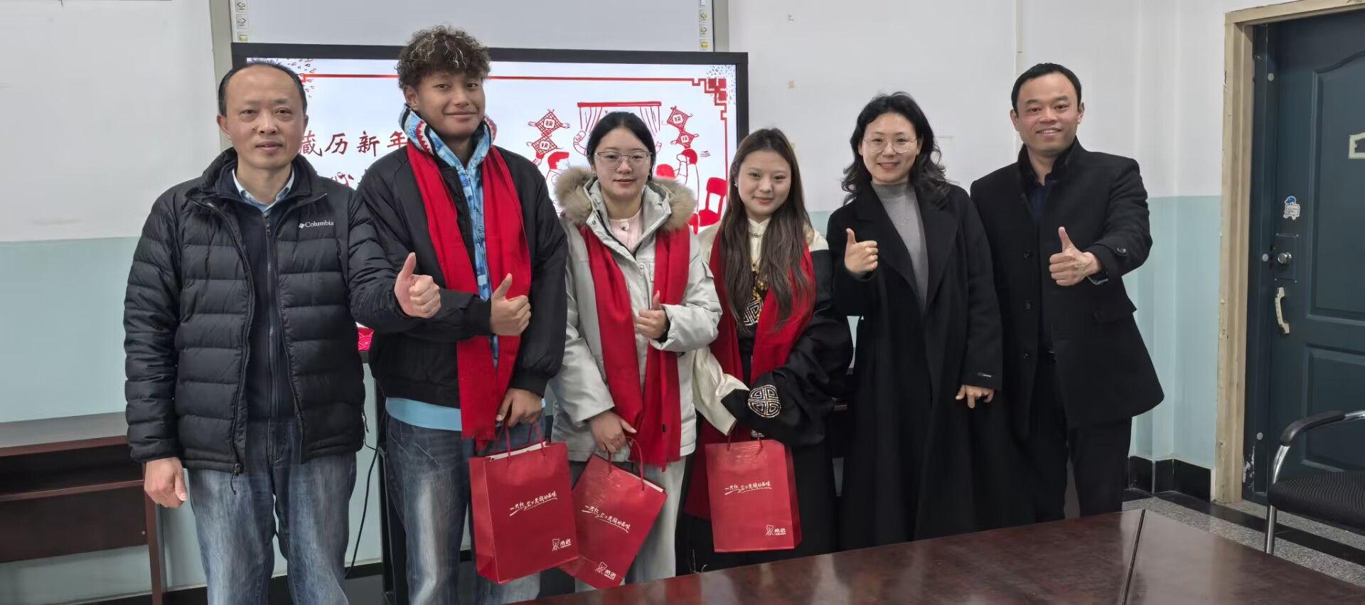 在传递祝福环节,赵书记为三位藏族同学一一送上了“吉祥如意中国红”围巾和精美“口碑”作为新年礼物。礼物虽小,却承载着公司对同学们的关爱与期望,希望藏族同学们在湖工学成“文武艺”,带着一身本领回到家乡,把党的温暖传递给更多亲朋好友,把家乡建设好,在更多父老乡亲中竖起自己和湖工的口碑。