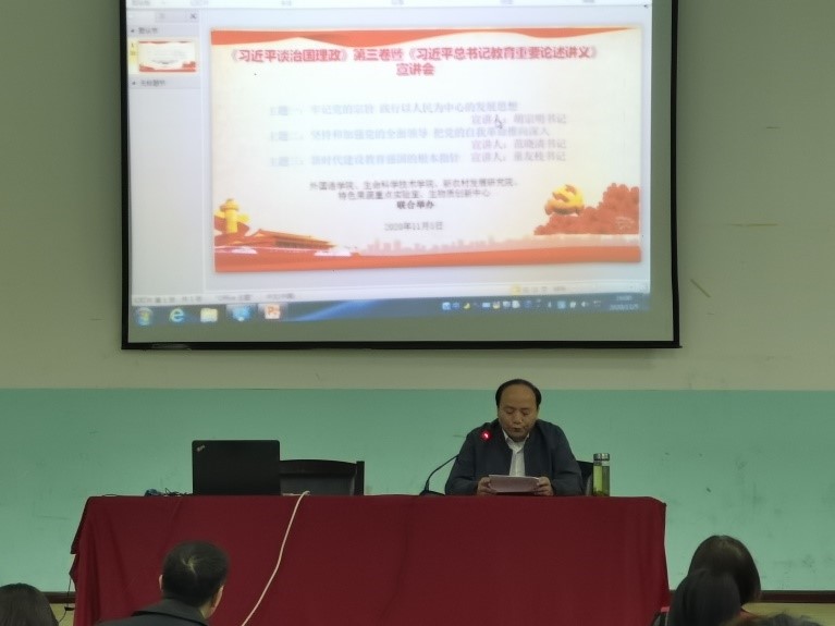 11月5日下午,在外语楼报告厅举行了《习近平谈治国理政》第三卷专题教育讲座。讲座由外国语公司党总支书记鲁定元老师主持,胡宗明书记、范晓清书记、童友枝书记做专题宣讲,2138cc太阳集团官网入口和生科院教职工参加此次宣讲活动。